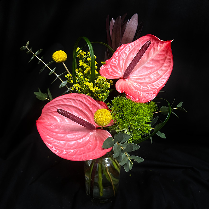Long-lasting, tropical anthurium flowers are the focal point of this arrangement! Stems come designed in a clear glass vase.
